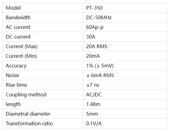 The PT-350 adopts a magnetoelectric sensor that accurately measures the current signal by testing the magnetic field signal generated by the current. The product is sturdy and durable, greatly reducing the difficulty of operation and improving the accuracy of measurement. This product is suitable for measuring and analyzing current data in high-frequency situations. High frequency current probes can be widely used in fields such as power supplies, semiconductor devices, inverters/converters, electronic ballast devices, industrial/consumer electronics, mobile communication, motor drivers, transportation systems, propagation delay measurement, etc. In addition, the use of a current probe is crucial in the process of troubleshooting. Through the current probe, the problem of poor overlap of cable connectors can be identified and rectified.