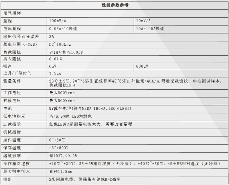 100kHZ, 0.05A-10A, 10A-100A compatible with any brand of oscilloscope.